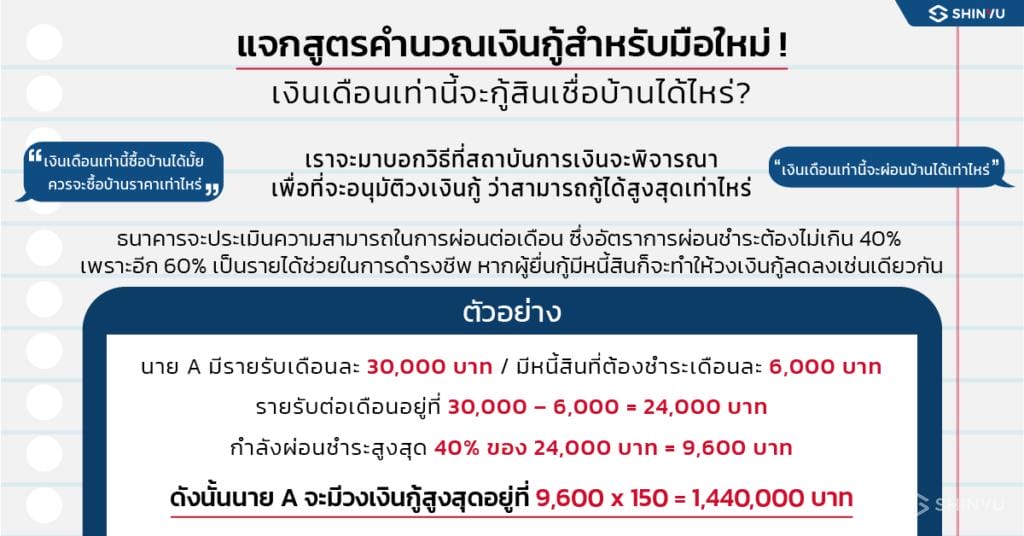 นาย A จะมีกำลังผ่อนชำระสูงสุดเพียง 40% ของ 24,000 บาท = 9,600 บาท นั่นเอง